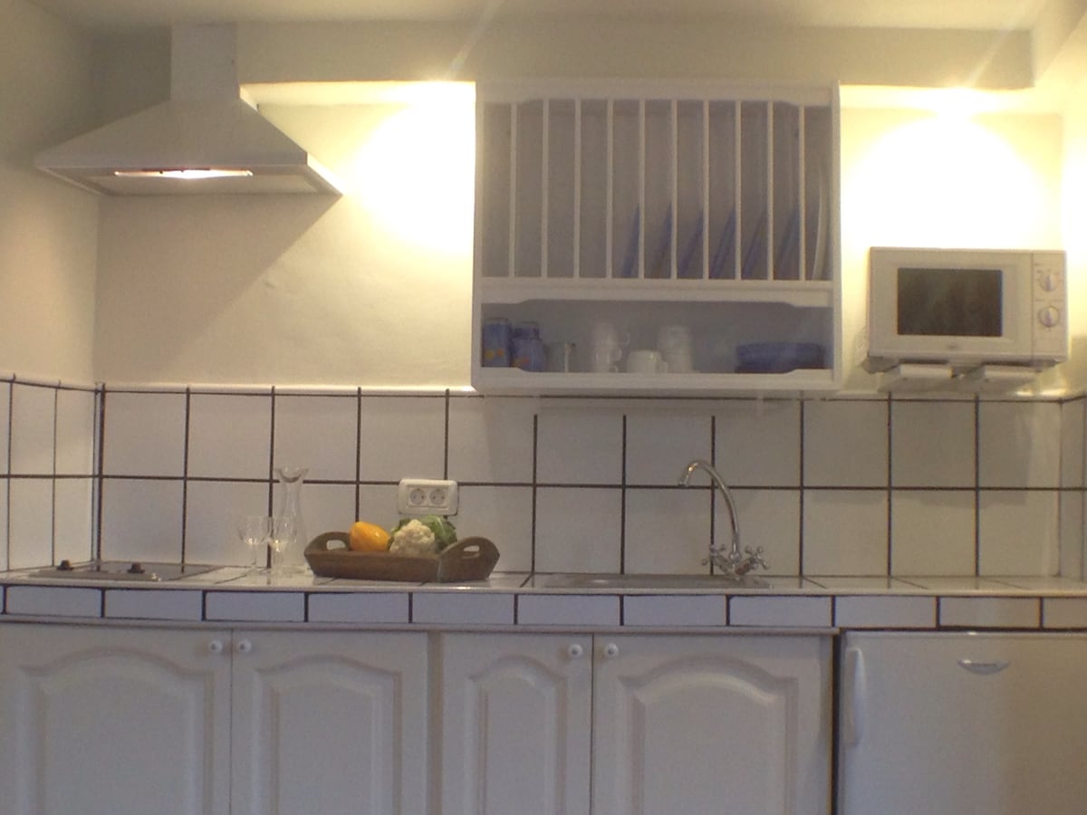 1-bedroom apartment with terrace for private use on the roof of the building. Main bedroom with double bed, sitting area with individual bed, bathroom with shower, living area with 3-seat couch, Smart-TV, dining table and fully equipped kitchen with sea view. Top terrace with large dining table, loungers and shower. A stay in a zen paradise.