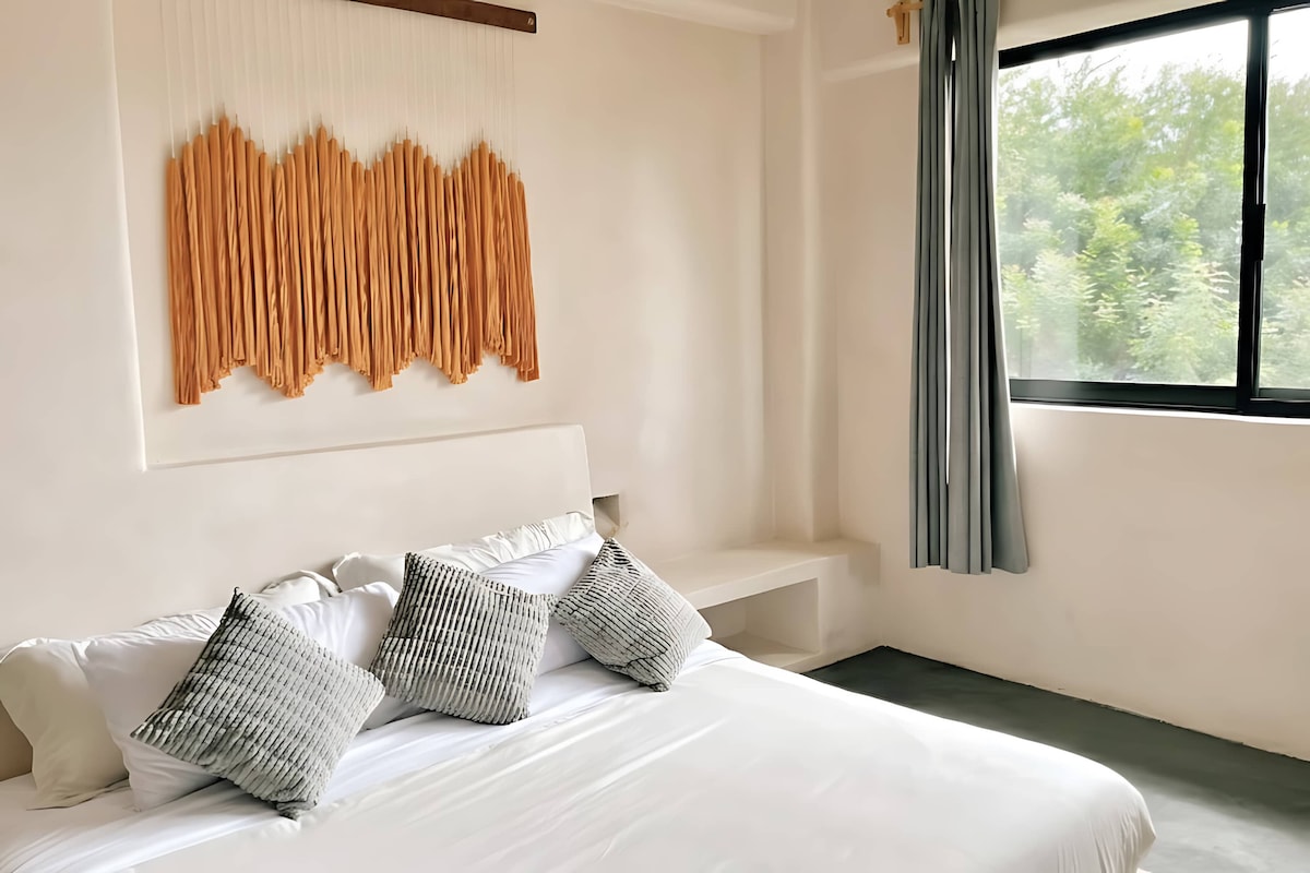 La habitación doble está en planta baja, ofrece un espacio cómodo, fresco y tranquilo, ideal para descansar o trabajar remoto. Su diseño boho-tropical, crea una atmósfera relajante perfecta para una estancia agradable. Cuenta con 2 camas queen size, A/C, ventilador, TV, WiFi, baño privado, frigobar, cafetera Nespresso y barra de cocina. Como huésped podrás disfrutar de las áreas comunes como la alberca, salón de coworking, sala de estar, cocina equipada y circuito de vigilancia.