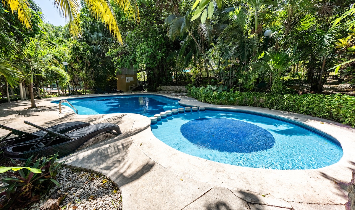 Spacious and comfortable Mexican colonial-style studio with fully equipped kitchen, 1 bathroom, satellite TV, and Wi-Fi. Relax in the cenote-style pool, enjoy another pool with palapa, chairs, and loungers, play on the tennis court, and take advantage of private beach access just 1 minute away. Perfect for couples, solo travelers, business travelers, or those seeking rest, combining comfort, exclusivity, and the best location in Playa del Carmen.