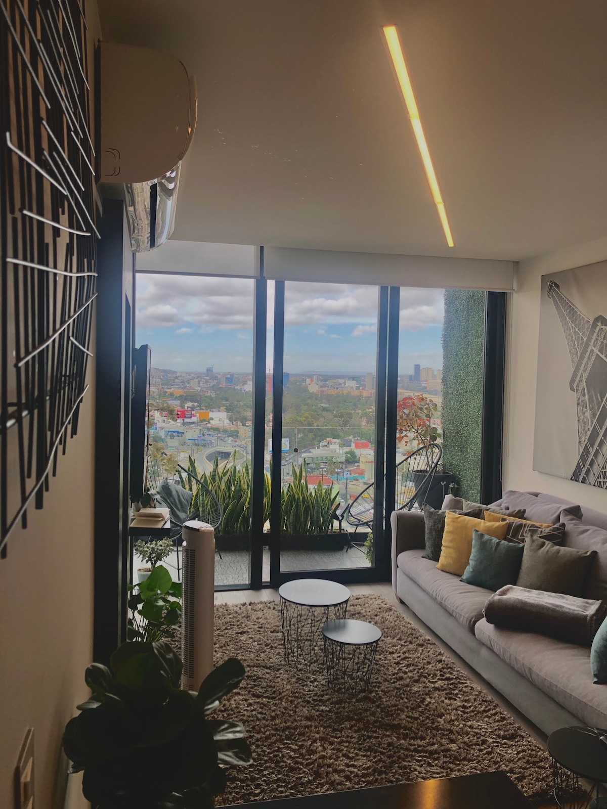 Elegant loft with concrete walls, steel beams, and wood finishes, and a botanical atmosphere painting a fresh and industrial style. In the bedroom, enjoy a huge view of Tijuana's most historic street. Head up to the rooftop to enjoy a concert and street views by a campfire. 24/7 security and card-only access. Experience Tijuana's most central location where clinics, supermarkets, bars, restaurants, and cafes are less than a 5-minute walk away.