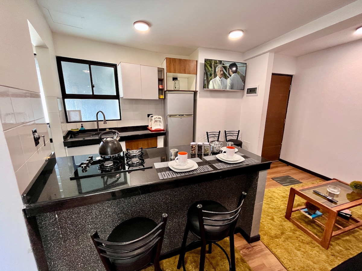 El departamento es encantador! La habitación cuenta con material de línea hotelera para un descanso confortable, la cocina y sala cuentan con todas las comodidades necesarias. La iluminación es perfecta! El departamento se encuentra en una zona completamente segura y centrica, a pasos de supermercados, embajadas, hospitales, bancos, cine, estaciones de teleférico, cafeterías, centros comerciales, bares de rock, discotecas, etc.