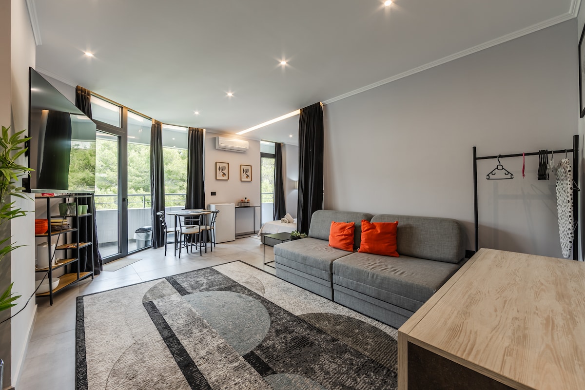 All the craftsmanship and creativity of one of Albania’s top interior design studios has been poured into this apartment. A space infused with Mediterranean simplicity, minimalist elegance, and a subtle “vacation vibe” in every corner. All of this is wrapped into 70 m² of comfort—including a generous 10 m² balcony where you can enjoy views of the aquapark and the rolling hills surrounding the village of Golem.