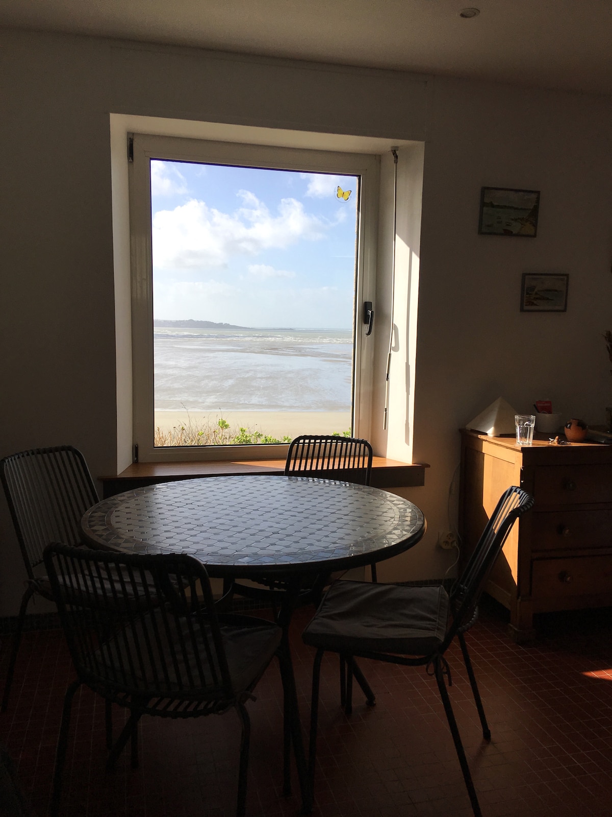 74 m² apartment with a sublime and incredible view of the seafront (10 m of bay window), located on the 1st floor of a typical Roscoff building It can accommodate 4 adults and 2 children: A bedroom with a large double bed One bedroom with two bunk beds (for children up to 12 years old) and a double pull-out bed Bathroom with shower Kitchen opens to living room Flat screen and Bluetooth speakers available Baby cot available upon request Linens provided