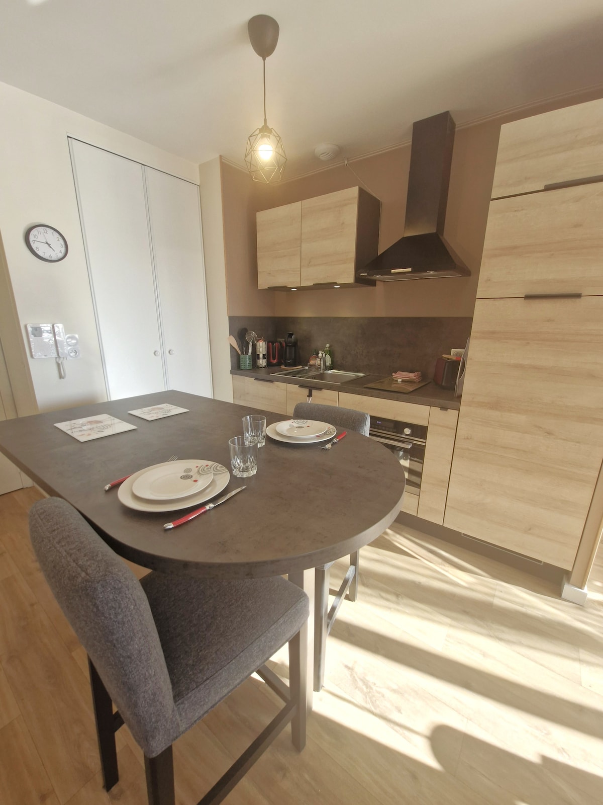 Accommodation of 30 m2, perfectly located, offers easy access to all sites and amenities, a stone's throw away... Tourist office, nautical center, bakery, hairdresser, cinema, swimming pool, tobacco shop, restaurants, nursing offices. It includes a main room with a sofa, kitchenette, 2-burner induction hob, small fridge, coffee maker (filters), kettle, microwave and kitchen utensils. Bathroom with shower, heated towel rail, hair dryer.
