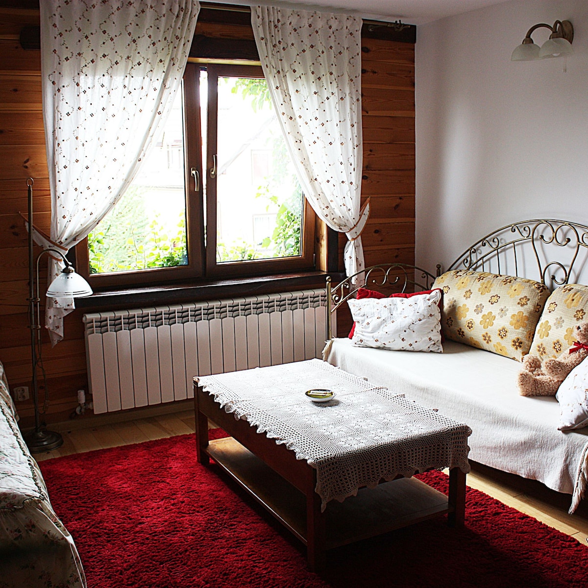 A 2-room apartment (60 sq m) with a bathroom, a private kitchenette, and a fridge. The room has a fireplace, 42-inch LCD TV, Polish digital terrestrial TV channels, WiFi, access to 2 balconies from each room and direct access to the garden.