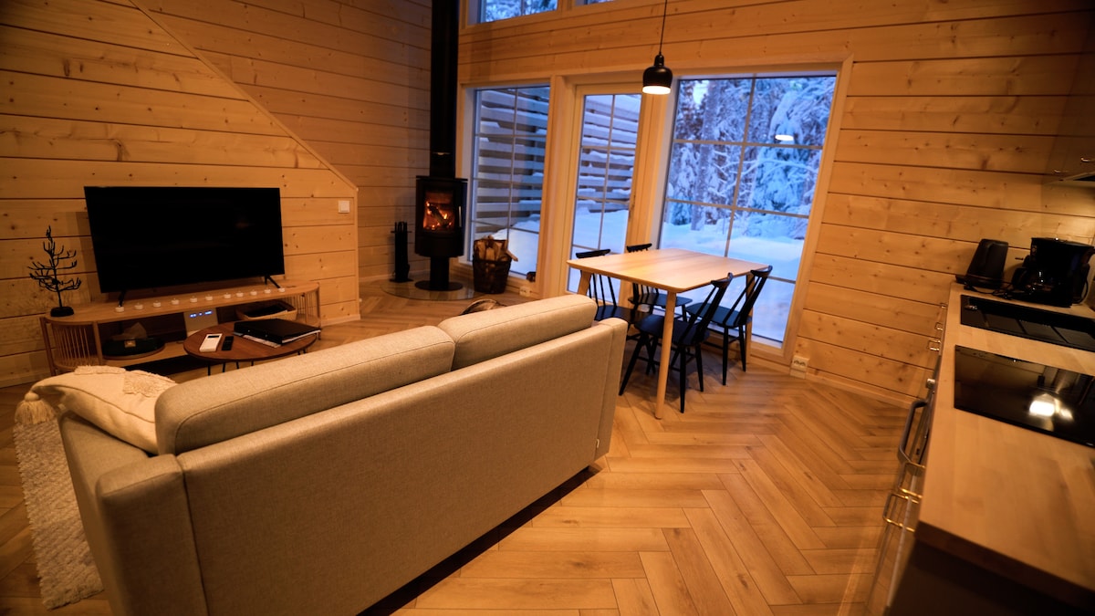 Disconnect from the outside world and relish in the privacy of this new cabin, a special place with towering lappish trees encircling you and a bubbling hot tub to enhance your Lapland experience. Imagine awakening each morning to the view of vibrant greenery or a snow-covered landscape, and then capping your day with a soothing sauna session. Inside, you'll discover a spacious 56 sq. m. area, featuring a Naava green wall, an HDTV, and 100 Mbps Wi-Fi! We also rent a car!
