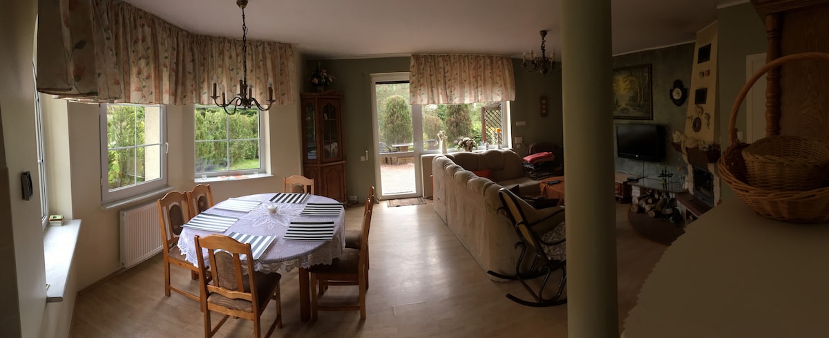 Entire attic space for your use! On the 1st floor, you’ll find 2 spacious double bedrooms (one with a balcony), a play area for children, a kitchen with basic amenities (fridge, coffee, tea), and a private toilet. The main bathroom on the ground floor is shared with the owners. Private parking, plenty of green space, and only a 10-minute walk to the castle in a quiet residential area.