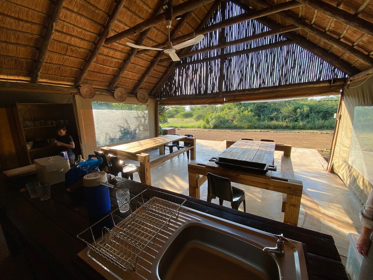 5 Tents with each 2 beds in the tent. Seperate Ablution block, kitchen and dining area, nice boma with fire place, Extra costs for Firewood, per bundle payable R50. Self catering ONLY. Entire camp booking ONLY. 1 - 4 guests pay R1200 per night. Each extra guest costs R300 per night. A 4x4 vehicle is needed to drive around. No game ranger or guard permanently in the camp. This camp is only for experienced out door lovers who are searching peace, quietness and be in nature.