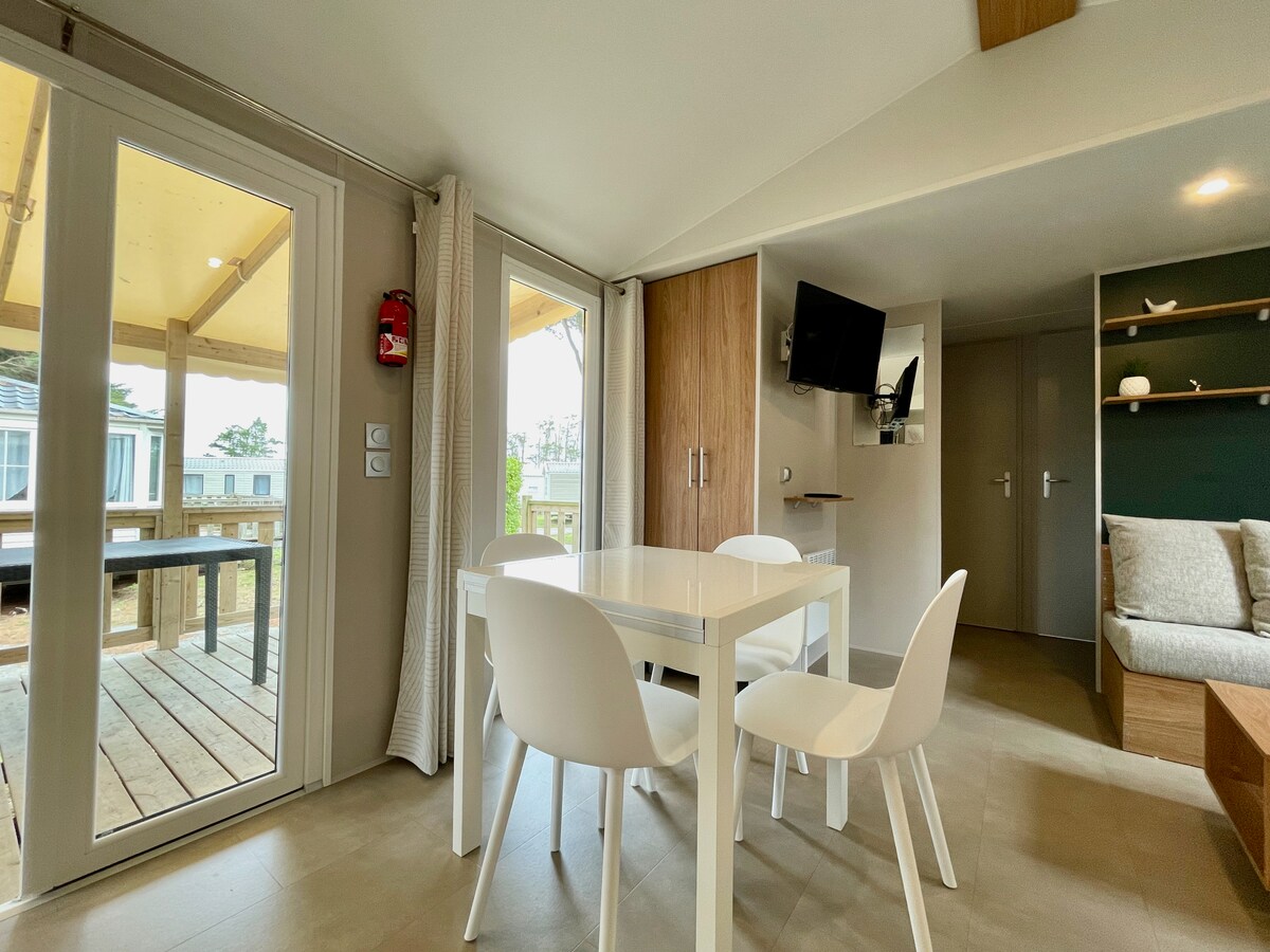 Stay in the heart of the Domaine de Kerlann in a modern and bright mobile home, ideal for families or couples. Enjoy a large fully covered terrace with outdoor furniture, a cocooning living room, two comfortable bedrooms, a fully equipped kitchen with many amenities (dishwasher, washing machine and WIFI), a bathroom with spacious shower and separate toilet. Parking is available in front of the mobile home. A comfortable stay between nature, ocean and conviviality.
