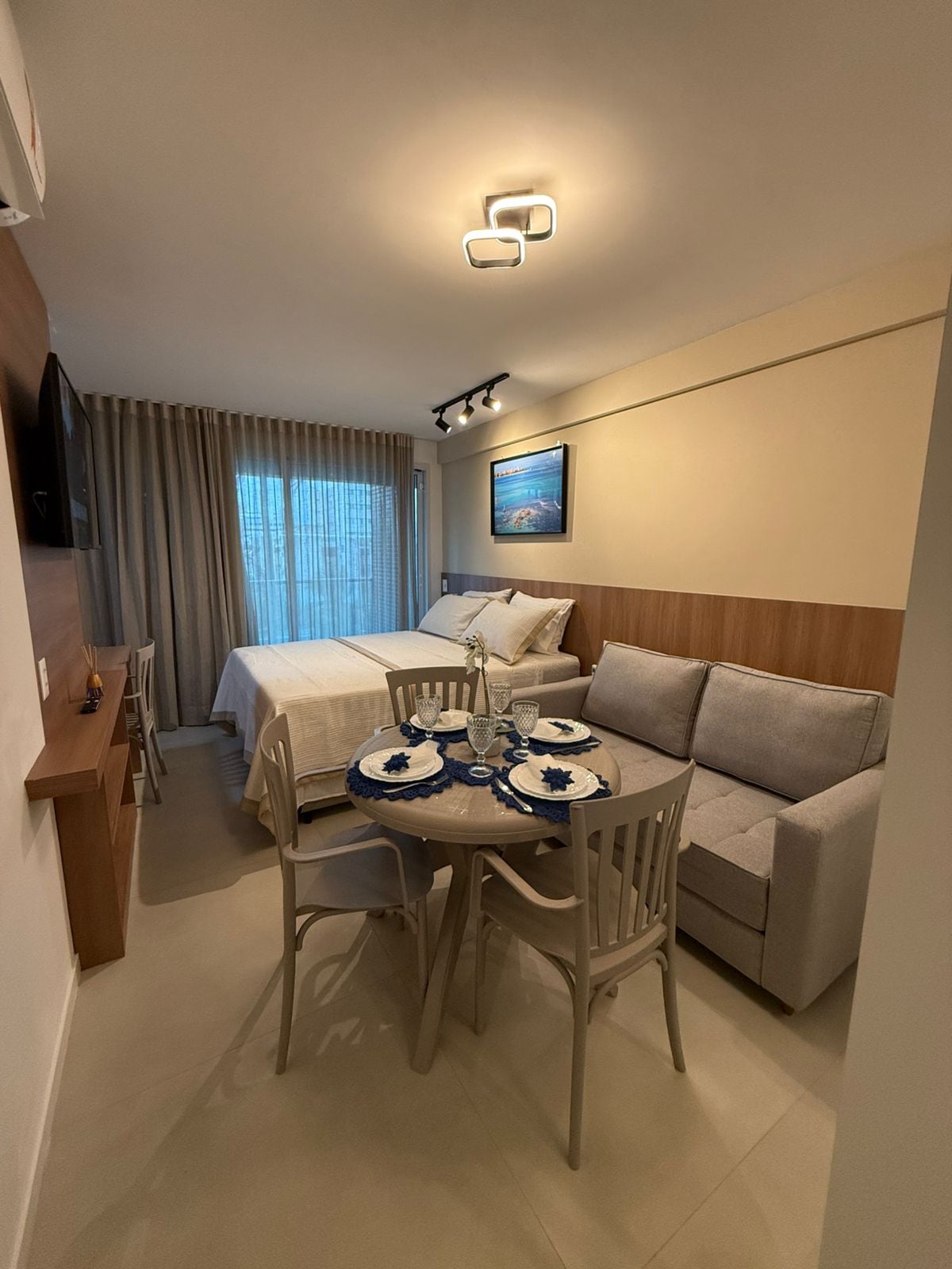 Flat tipo studio, super confortável com vista para o mar. Cama queen, sofá-cama tamanho cama de casal, TV com canais por assinatura e prime vídeo, Disney plus e mais, cozinha completa, ar condicionado, estacionamento rotativo grátis, e mais. Wifi grátis, academia, area kids, piscina de borda infinita, e recepção 24 horas. Reserve agora!