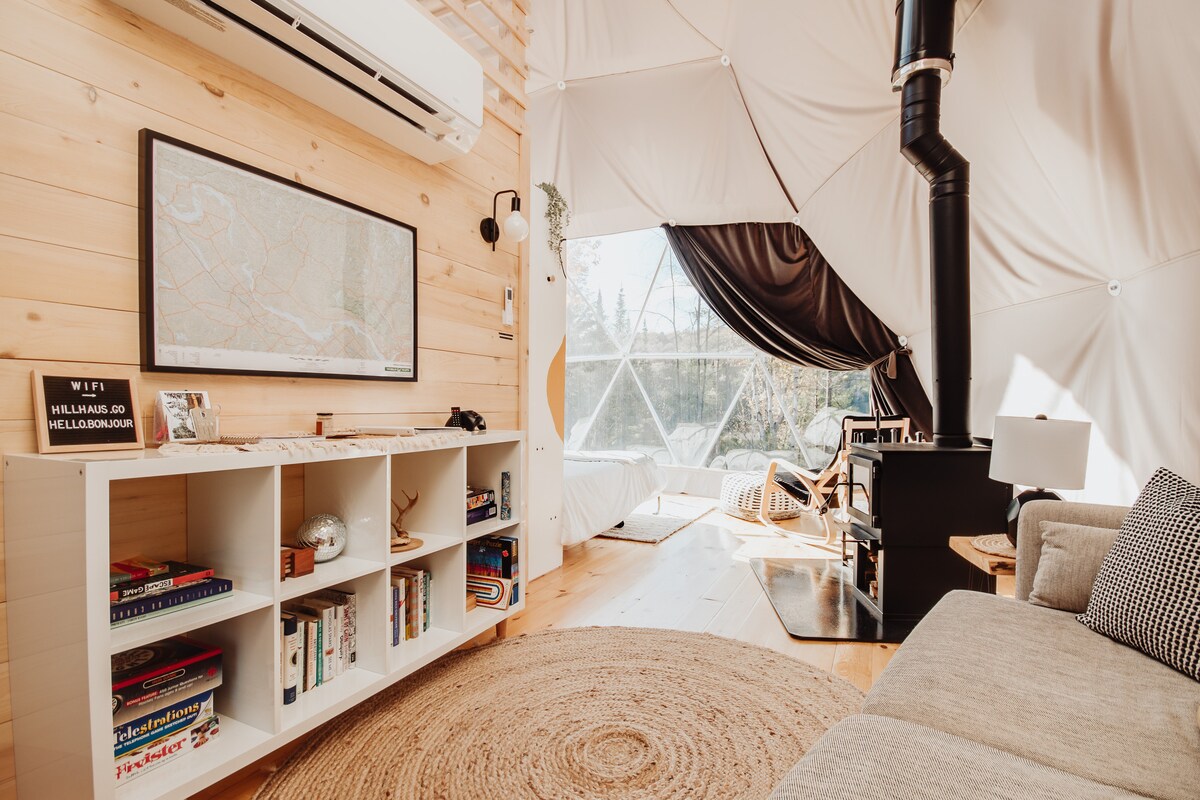 Luxury lakeside geodesic dome *Private sauna *queen-sized bed *stargazing skylight *full bathroom *kitchenette *fire pit *vinyl player Enjoy the ultimate romantic retreat. Mansfield-et-pontefract has many wonderful experiences to offer such as skiing 2 minutes away at Mount Chili, skating and great local restaurants. This dome has 70's inspired decor complete with vintage vinyl records and record player.
