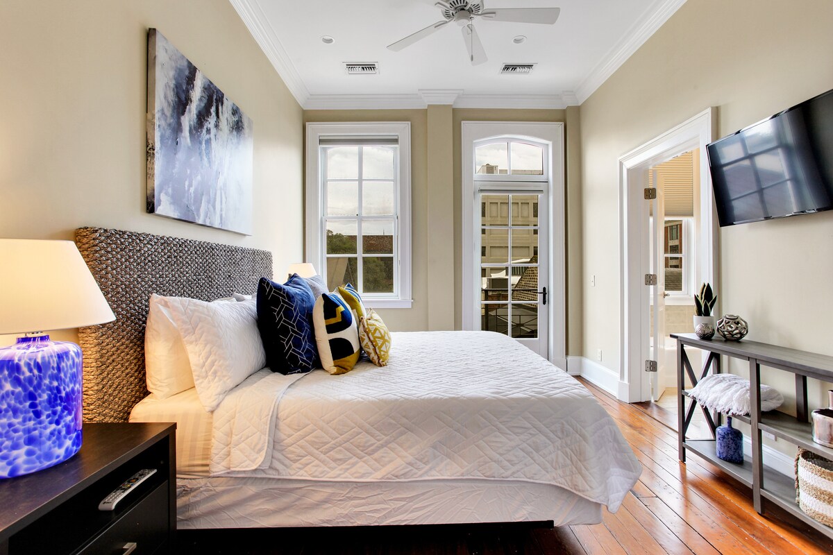 Enjoy our peaceful and spacious condo, perched on the second floor of our historic Savannah estate, just steps away from Forsyth Park! This 1-bedroom, 1-bathroom condo (with a convenient pull-out sofa, great for your extra guest!) is the perfect home base for your Savannah stay! Fully-equipped kitchen with all the amenities, cozy and comfortable living space with flat screen SmartTV, fast WiFi, and the cherry on top...a HUGE private balcony! SVR 01789