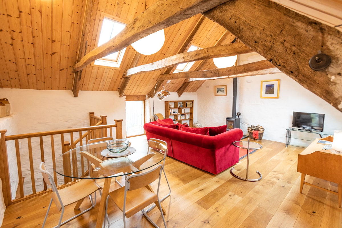 Romantic Pembrokeshire cottage in beautiful 3-acre grounds with sauna, natural swimming pond (rain dependent), games room & kayaks. Hill walks on the doorstep, stunning beaches & cliff walks nearby. Stargaze from a comfy king-size bed. Snuggle up by a wood-burning stove (free wood). Large bathroom with bath, shower & underfloor heating. Well equipped kitchen with coffee machine. Covered outdoor seating area with firepit & bbq. Fibre internet, smart TV (Netflix etc). 2 well-behaved dogs welcome.