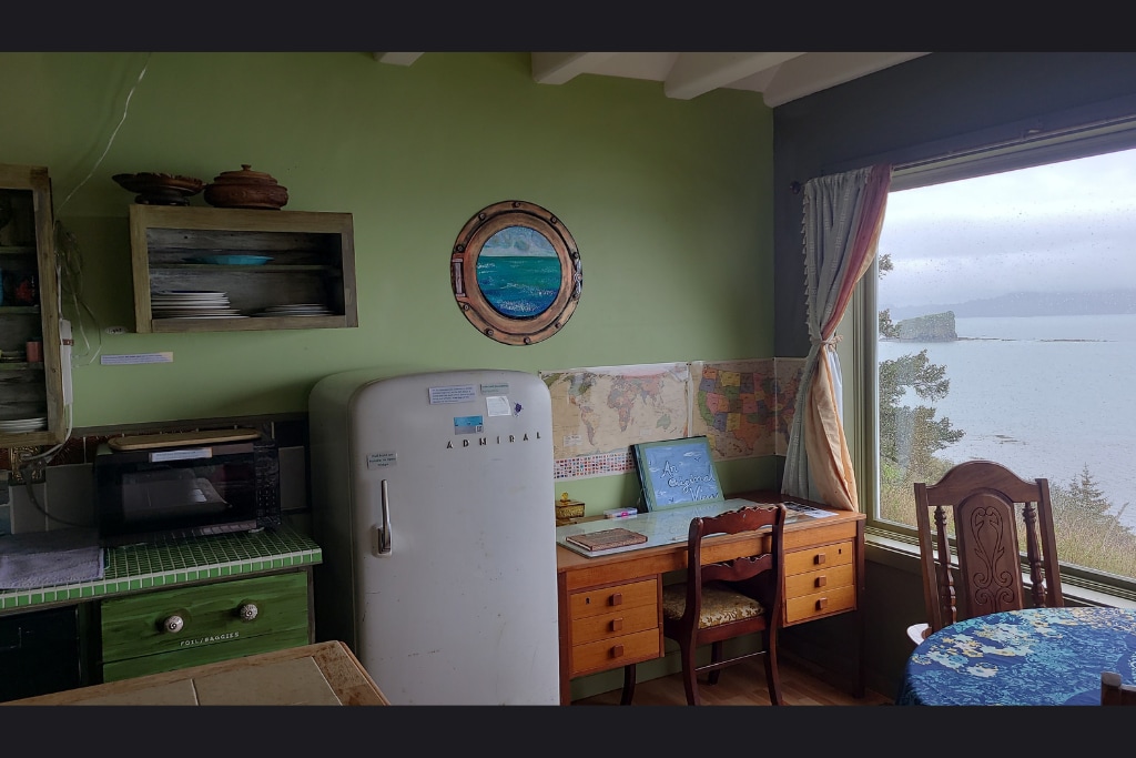 The BnB is located on the 2nd floor of our oceanfront home. This upstairs, fully furnished apartment has a private entrance that requires you to walk up 14 steps. The bedroom, living room and kitchen all have ocean views that look out over historic Mill Bay. There is a private deck where you can sit and regularly observe Bald Eagles, Sea Otters, and more. We are just 3 miles from the city center, 1 mile from Safeway and Wal-Mart, and 1/2 mile from beautiful Fort Abercrombie State Historic Park.