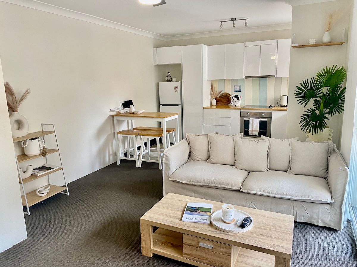 This well-located and homely studio is located directly across from Shelly beach; a quiet and long stretch of the pacific ocean, and only 5 mins from popular Flynns and Lighthouse beach. This perfect location is also only a 5 min drive from the town centre where you can immerse yourself in the abundance of great restaurants and cafes on offer. The apartment would best suit a couple or friends looking to relax and unwind in beautiful Port Macquarie. Not really set up for infants or kids.