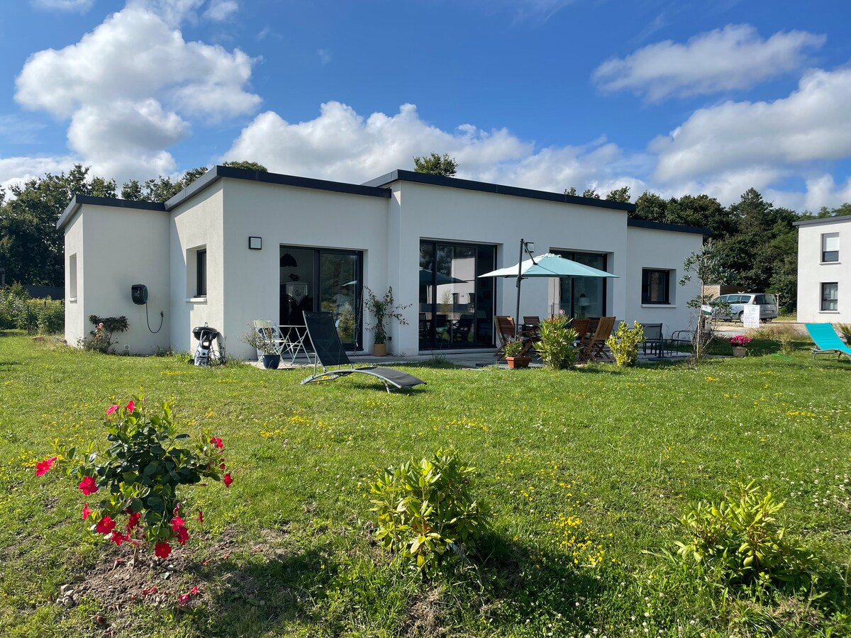 Pleasant bright single-storey villa, recent construction near the sea (800 m), with a large living room with adjoining south-facing terrace, a fully equipped kitchen, 1 first bedroom master suite with private bathroom, 2 other bedrooms with bathroom, bathtub and shower. 7 beds in all distributed in the three bedrooms. Sofa bed: possibility of 2 extra beds in the living room. 2 night minimum booking.
