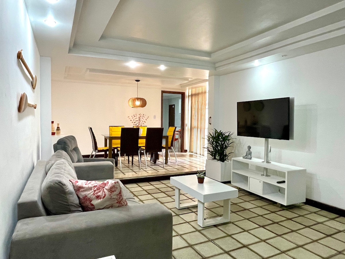 Entire apartment, furnished. Balconies overlooking the ocean and pool. Great location! Close to beaches, malls, pharmacies, markets, restaurants and tourist attractions. Swimming pool with a pleasant leisure area and restaurant. Tranquility, safety and comfort. 24-hour reception, facilitating check-in and check-out. Daily maid service (except Sundays and holidays). Great option for Carnival, 50m from the best party circuit and the best cabins, overlooking the circuit.