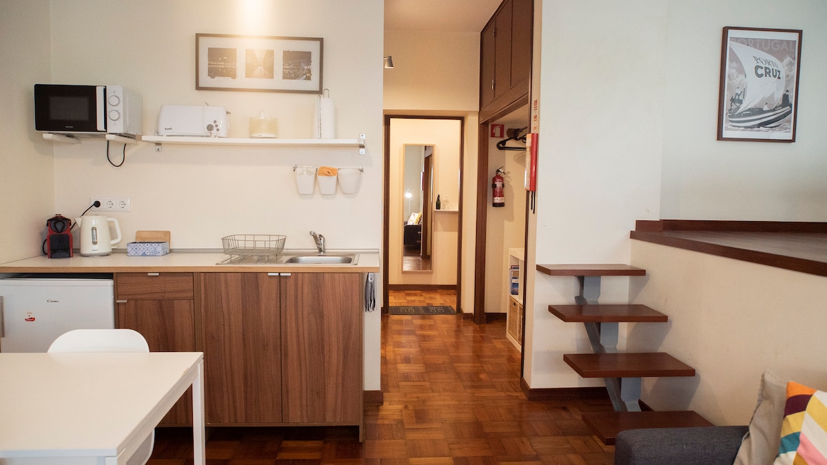 Welcome to our cozy mezzanine. The studio features a fully equipped kitchen, added following guests’ feedback, so you can comfortably cook and feel at home during your stay. Free private parking is available in a secure area, with an EV charger at extra cost. Queen-size bed and sofa bed. Cable TV and high-speed Wi-Fi included. Walking distance to metro, shops, restaurants and Porto city center. We’re always available if you need anything.