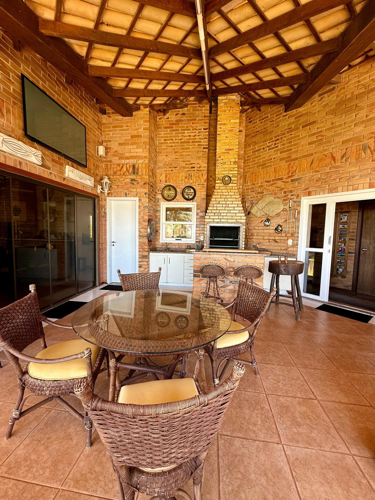 Casa com 115m2 Sala + Cozinha 2 quartos 1 banheiro Área de Churrasqueira Garagem coberta (2 carros + barco) Quarto 1 ( até 3 pessoas) 1 cama de Casal + 1 cama de solteiro com Ar condicionado. Quarto 2 ( até 4 pessoas) 2 beliches de solteiro com Ar condicionado. Casa ideal para quem quer espaço, garagem ampla para carros ou embarcação, com área de churrasqueira para festa.