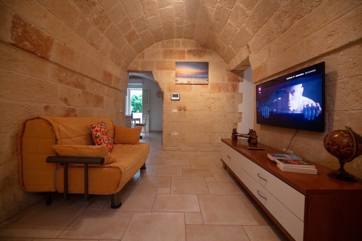 Located in the very center, typical independent house, very bright and comfortable with typical barrel vaults in tuff, equipped with a bedroom, kitchen, bathroom, two balconies and pleasant large terrace, Wi-Fi, air conditioning. Just 20 meters from the main square Aldo Moro, 50 meters from the heart of the historic center and the picturesque Lama Monachile beach. The location of the apartment will surprise you for its comfort, privacy and tranquility