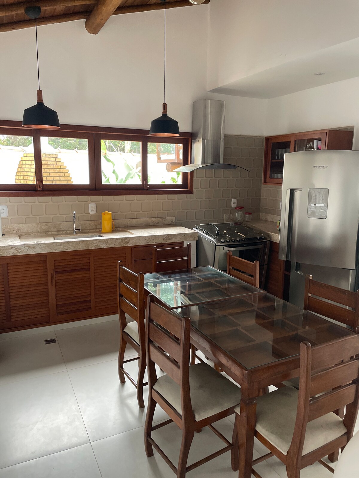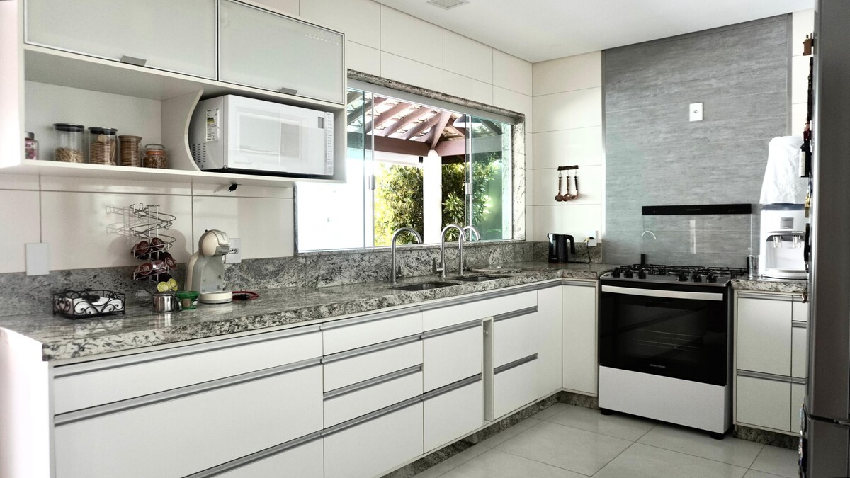 Esta acomodação elegante é perfeita para viagens em grupo. Casa localizada em um condomínio fechado com portaria 24 horas. Jardim lindo com piscina, ducha, área gourmet com churrasqueira. Garagem para 2 carros, sala com cozinha americana bem arejada, sala de tv com sofá. Varanda grande com sofás, redes e mesa de jantar! São 3 ar condicionado, 2 em casa suíte e 1 na sala. A casa tem mais uma suíte master no andar de cima.