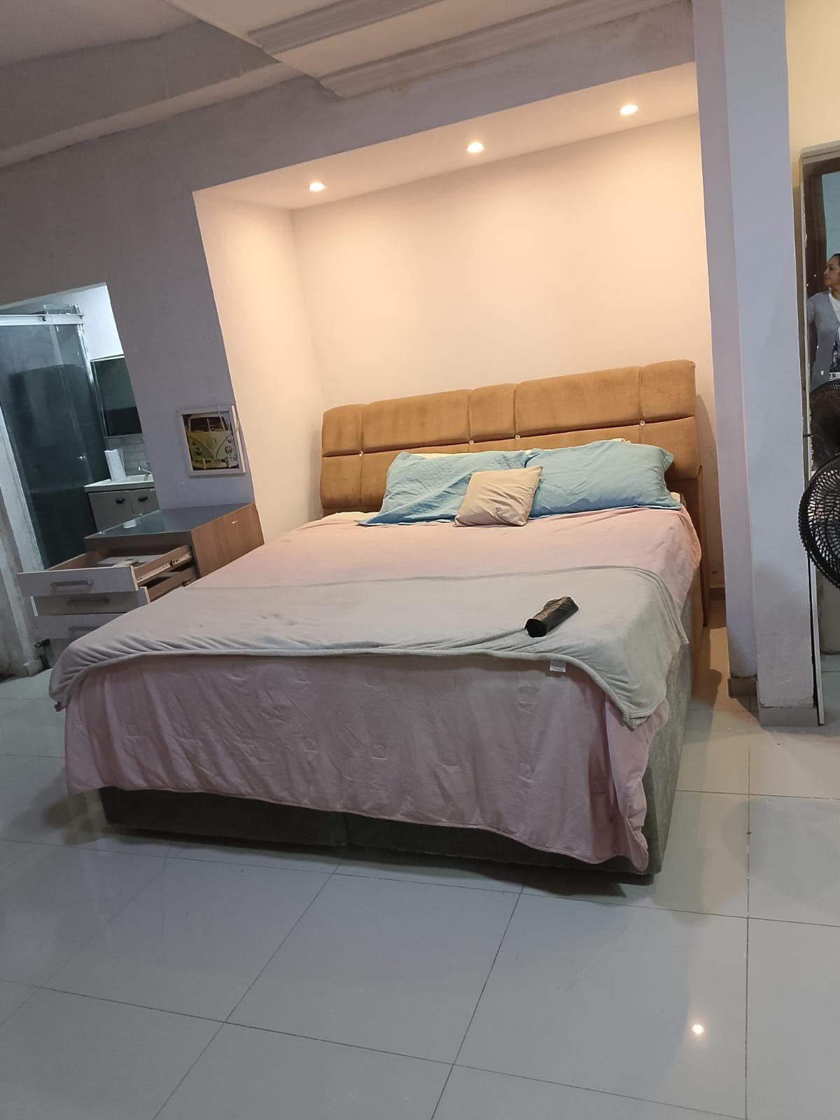 house with living room with sofa, TV, dining room with table with 6 chairs, 1 bedroom with suite 1 double bed and 1 single bed, 1 bedroom with a 1 single bed and single mattress to accommodate another person, central air in both bedrooms, 2 bathrooms, fan in the living room, kitchen with refrigerator, cabinet, stove, electric rice cooker, Ayer frier, microwave grill, blender, laundry area with external bathroom, washing machine does everything, with nearby shops!
