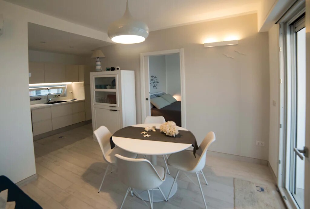 Apartment with large terrace overlooking the sea. Two bedrooms for a total of four beds. Equipped with two bedrooms, one with a double bed and one with two separate beds that can be joined together if necessary. The roof is made of insulated wood, which in addition to making the house perfectly insulated, together with the aged parquet creates a warm and vintage atmosphere at the same time. The living room-kitchen has a splendid kitchenette. Equipped with a large terrace overlooking the sea.