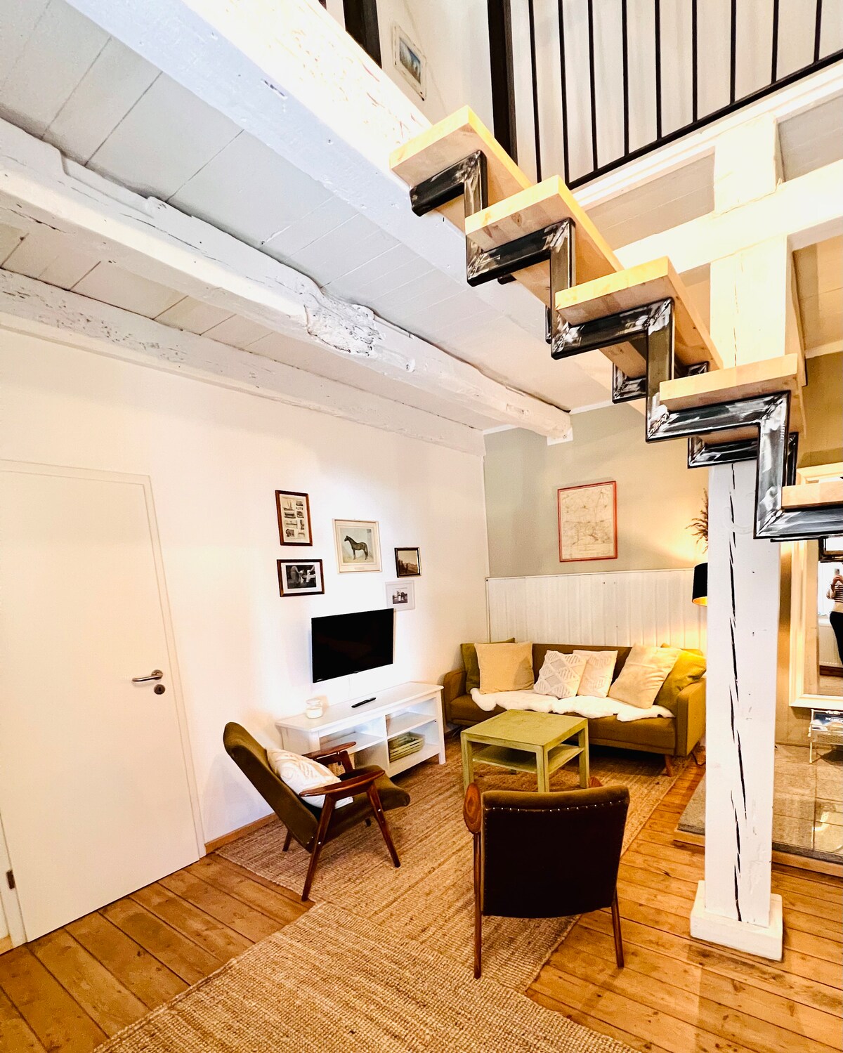 An 80 m² apartment over three open floors on our idyllic four-sided courtyard in the artist village of Bahnitz. The lattice windows offer wonderful views of the countryside and 50 meters away from our romantic garden the Havel flows along the small beach.