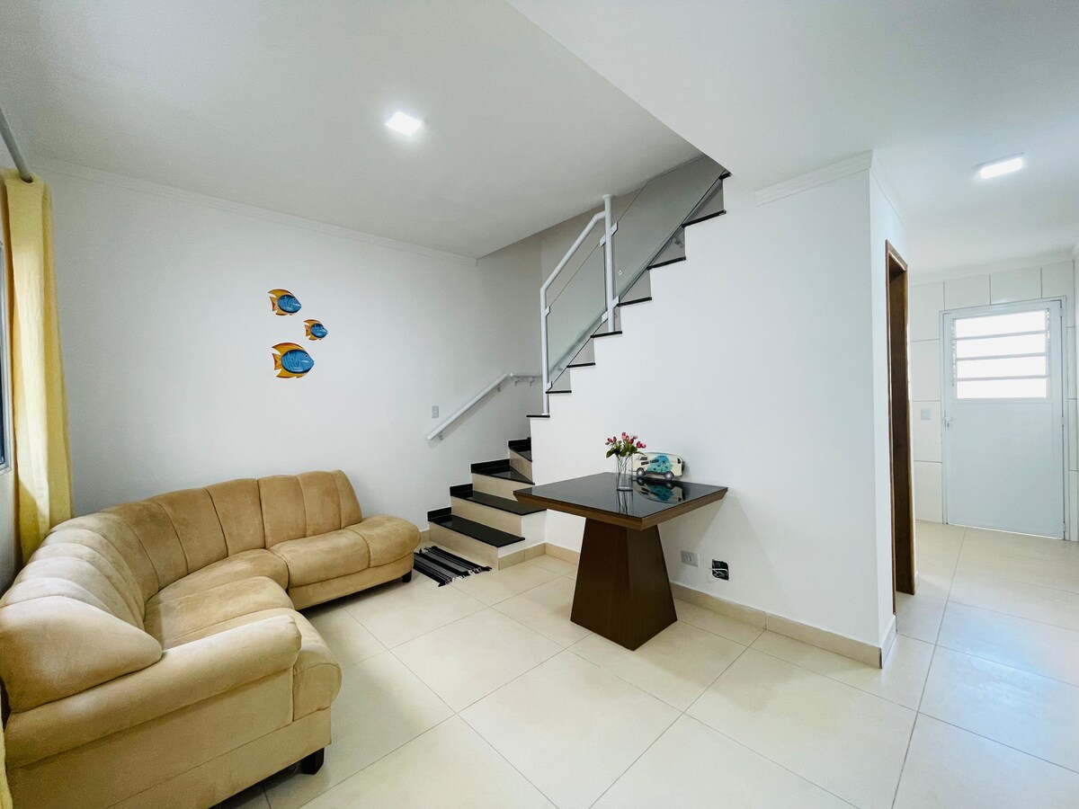 Beautiful House in Mongaguá, 90 meters from the beach. Excellent outdoor space with swimming pool, barbecue/oven and wood-burning stove to make that barbecue or that food with a lot of fun by the pool. Living room with pool table and ping pong table. Wi-Fi Internet NETFLIX Alarm system Total of 3 bedrooms (4 single beds and 2 double beds, plus 7 mattresses). The house has 3 bathrooms in total. Ground floor house, excellent for people with limited mobility.
