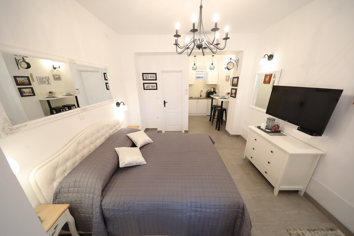 Luxury studio apartment with kitchen, bathroom, Tv and air conditioner ideal for two person. Free parking also included. Bus station, Gaženica port and City Center are 5min car drive. The beach is 300m away from apartment.