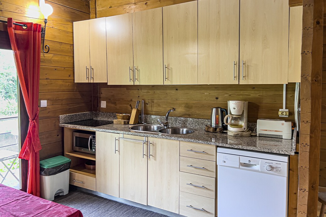 The Chalet is surrounded by nature, with green areas, trees, plants, and excellent sun exposure. It has a bedroom with a bunk bed (a double bed that 'acts as a sofa' and on top a single bed). The toilet has a shower. The kitchen/living room has a table, chairs and benches. Exterior balcony with Jacuzzi, tables and sun loungers. Leisure area and gardens with tables, hammocks and slides, balls. Fenced property, for exclusive use. Excellent for sports; gymnastics, badminton, paintball, others.