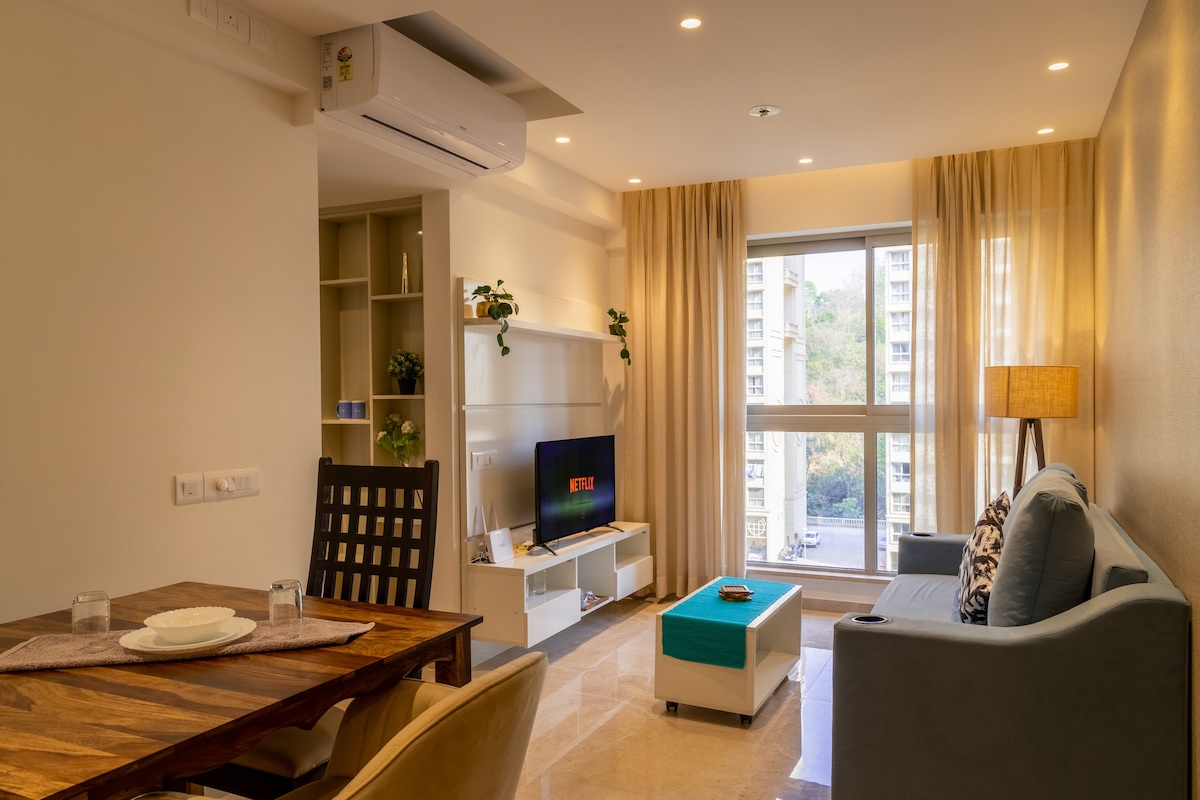It's ultra stylish 1 bedroom smart kitchen & Living room apartment located 30 minutes from T2 (International airport) , 7 mins drive to R city mall 30 mins to BKC and many more important places close by. Its centrally located with a awesome view of vibrant skyline and glimpse of peaceful lake overlooking the apartment.Great for kids as parks and lot of activity available nearby. Not to forget many happening night life, pubs & discs nearby.