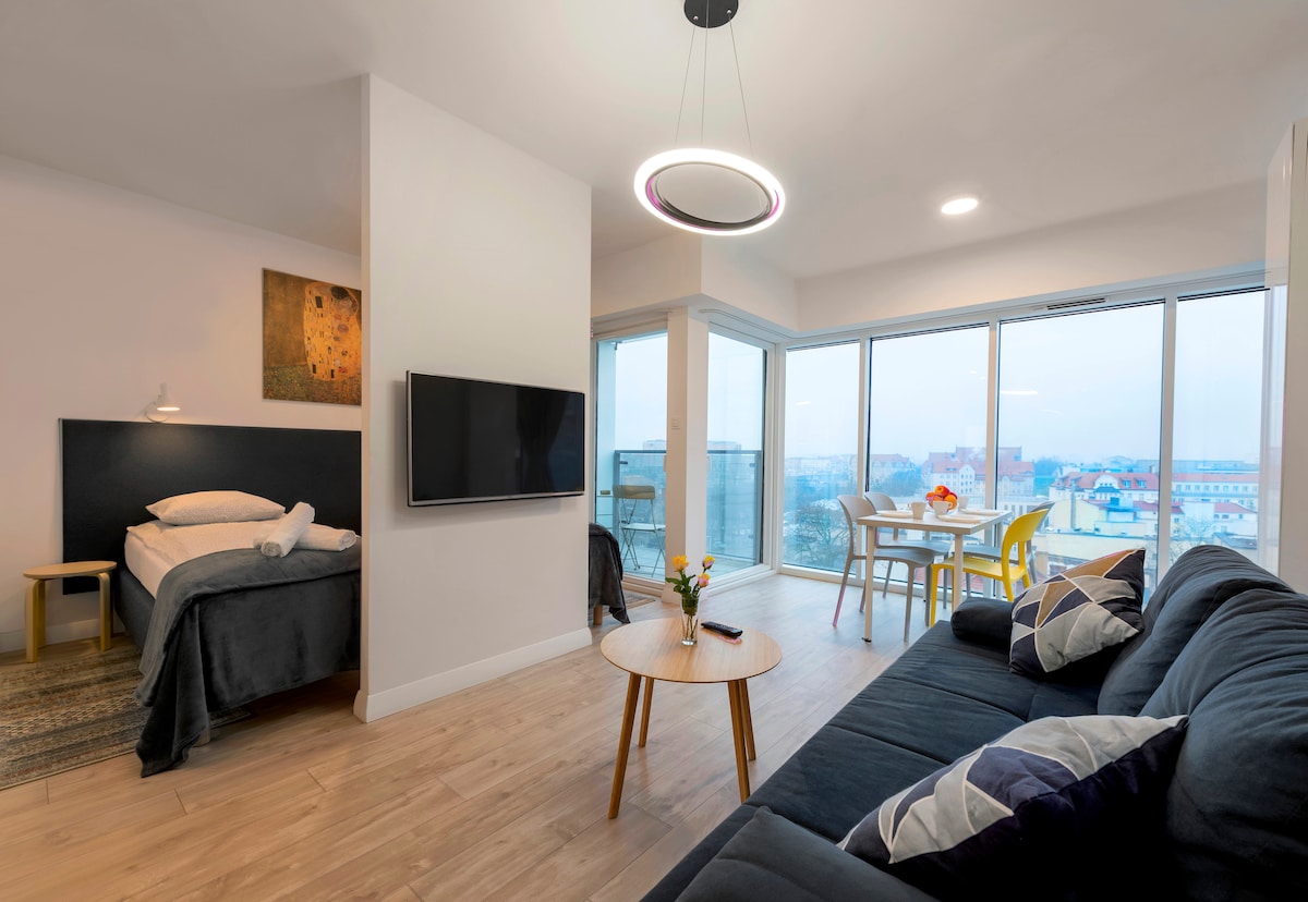 The location is right next to the main station, actually 100 meters from the station with a view of its beautifully illuminated roof. The entrance to the Targi is 300 meters away, just around the corner. There is a studio with a large bed, an equipped kitchenette, a comfortable table and a glazed bathroom. The kitchenette has dishes, coffee, tea, and a coffee maker. The apartment has air conditioning, and it also has a parking space in the underground garage. Observation deck on the 22nd floor.