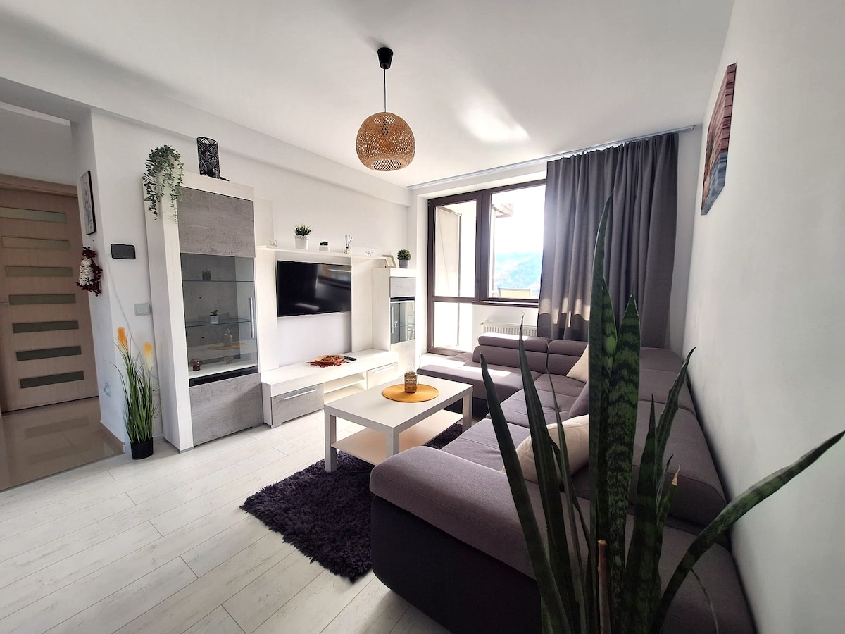 Delightful studio in a cozy and quite location between the mountains. The apartment has high-speed internet, fully equiped kitchen, a modern bath, a balcony with a splendid mountain-view and a private underground parking spot at -2 level. The building and the home furniture are new. The apartment is professional disinfected after each visit. Smart home - easy access by code. The building is protected 24/7. *Feel free to message me, I might have a special offer for a non-weekend nights!