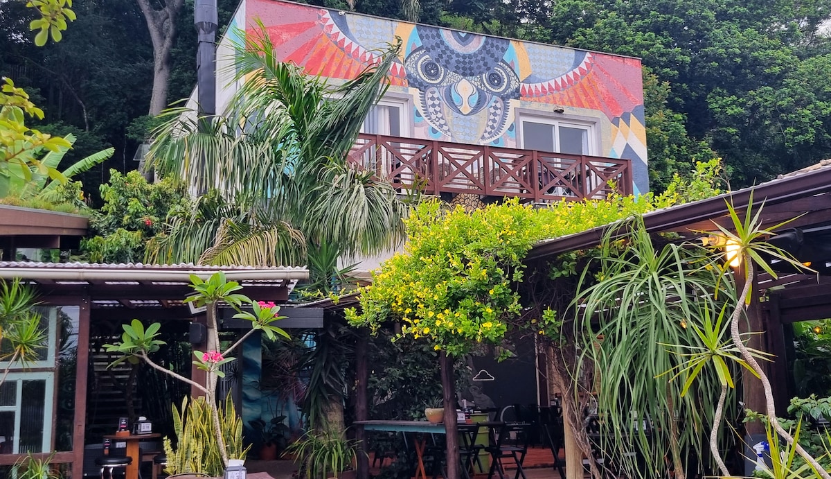 The space is ideal for a couple, with a large, combined and cozy room. In the outdoor area, there is a beautiful pergola, good for outdoor dining or reading books that I make available. Located in the north of the island, between three beaches. 750 meters from Ponta das Canas beach, 850 meters from Lagoinha beach and 1 km from Brava beach. Near the house are supermarkets, restaurants, a pizzeria, hamburger joint, fitness center, laundry, pharmacy, beach supply store, florist and ice cream parlor.