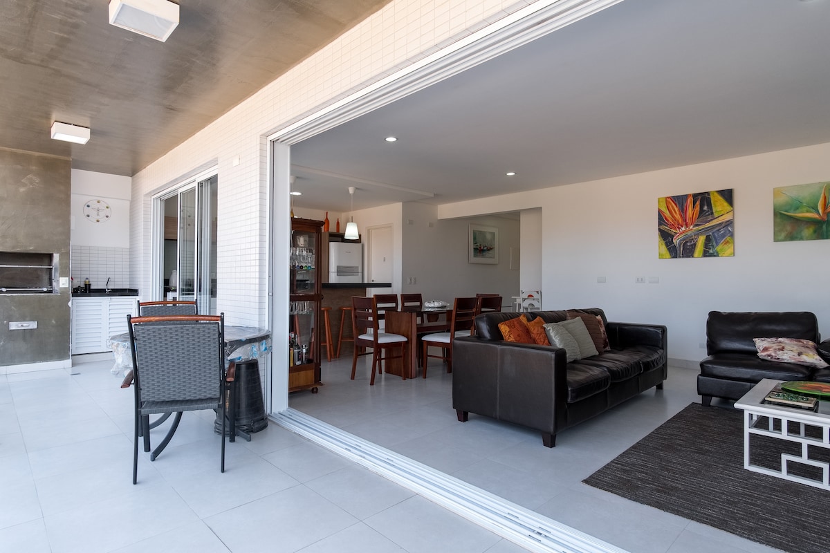 Apto135m², grande, bonito, confortável, arejado! Bem localizado. Apenas 12 aptos o que evita aglomeração. 3 quartos, 1 suite com TV smart e varanda. Camas : colchão Castor de primeira linha! Ar condicionado nos 3 quartos e sala Varanda gourmet grande com churrasqueira privativa. 2 garagens! Sala 3 ambientes, TV Smart 65 polegadas! Cozinha equipada! Piscina, sauna! Brinquedos de praia, cooler, kit de papel higiênico, sabonete. Prédio monitorado por vídeo câmeras e alarmes. Ambiente familiar!