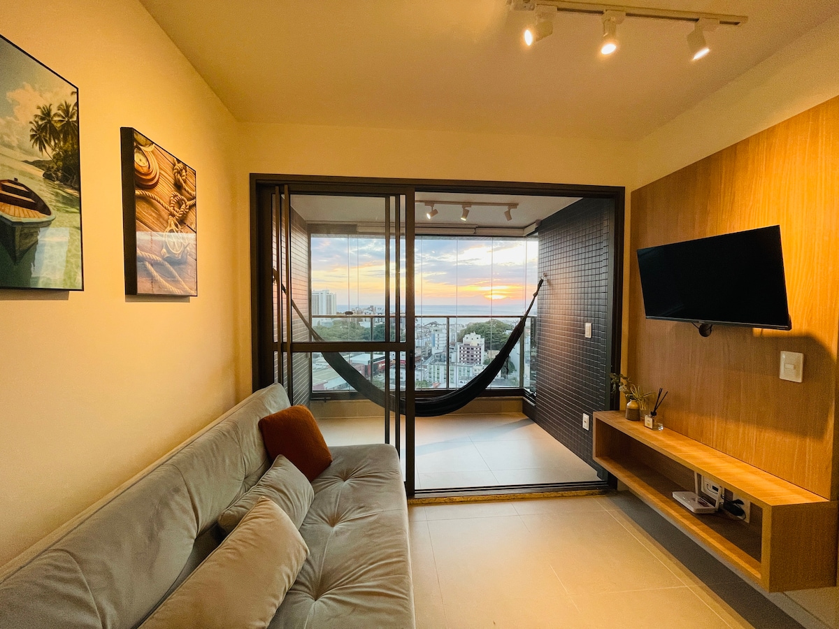 Managed by @Insider.Bahia - Apartment with sea view, a few steps from Farol da Barra beach, with cozy and very elegant decor. Bedroom and living room apartment, with air conditioning, perfect space for the home office with high-speed wi-fi, large and cozy balcony, fully equipped American-style kitchen. Apt has a free parking space. Located close to the "Farol da Barra" fort, beaches, museums, restaurants and bars, the space is an invitation to the beauties of Salvador.