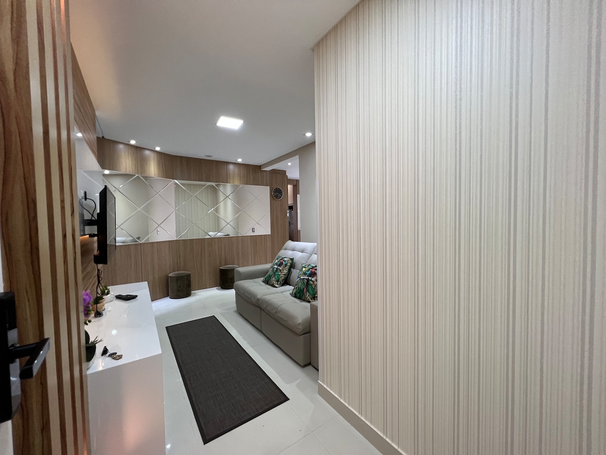 Modern and cozy apartment located in Residencial Sunny Flats, approximately 400 meters from Bombas beach in Bombinhas. It has a beautiful outdoor area with a swimming pool on the terrace, gourmet area, fire pit, games room, and kids' area. It has an integrated living room and kitchen with a dining table, a guest bathroom, 1 air-conditioned bedroom, a sofa bed in the living room, and a balcony with a private barbecue.