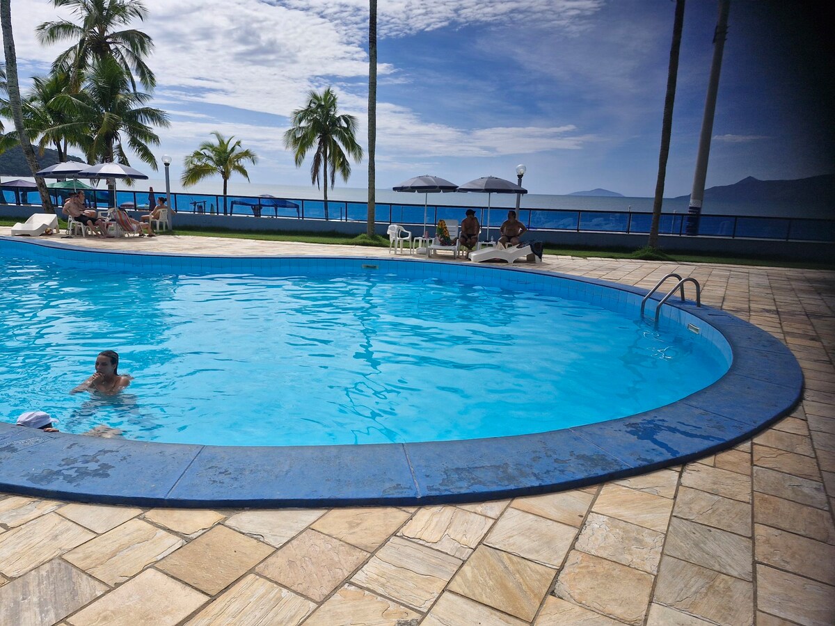 ATTENTION: NEW YEAR'S PACKAGE RELEASED, from December 29 to January 3, only 6-night package. Room with air conditioning, full kitchen, Sky and private bathroom on the best beach in Caraguatatuba! Cozy and very comfortable, surrounded by a beautiful garden. With private parking, close to the beach, supermarket and bakery. Ideal for couples, accommodates up to one child up to 10 years old at no additional charge. For children over 10 years old, please consult.
