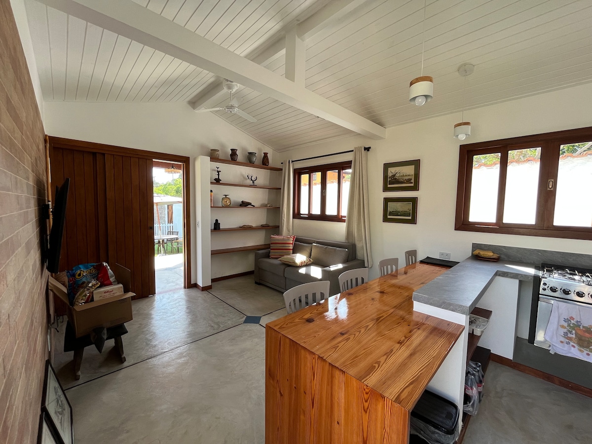 Located 800 m from Ferradura Beach and Rua das Pedras, the house is ideal for couples seeking tranquility, comfort, and a great location. It features a bedroom with air conditioning, balcony with deck, living room, kitchen for light meals, covered barbecue, Smart TV, Wi-Fi, bathroom, outdoor shower, parking, and a charming outdoor area. A calm and pleasant place to relax after the beach or a walk downtown.