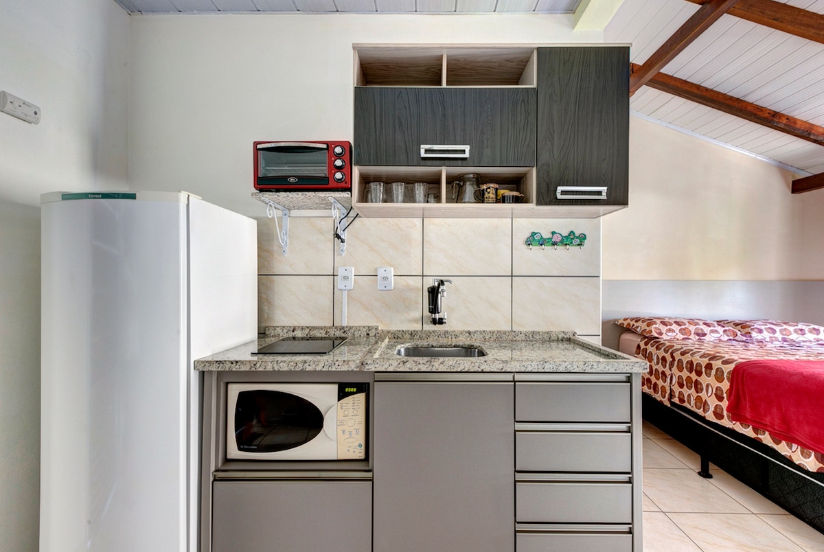 Boaventura Flats is the ideal place for your vacation! Family atmosphere, for quiet people! With a privileged location in the Lagoa da Conceição neighborhood, 2 km from Joaquina beach, 1.5 km from Mole beach and a 3-minute walk to Avenida das Rendeiras. The loft is furnished with cold air-conditioning, 1 double bed, smart and cable TV, wardrobe, table with chairs, bathroom, full kitchen with refrigerator, microwave, 2-burner cooktop, blender, coffee maker and basic kitchen utensils.