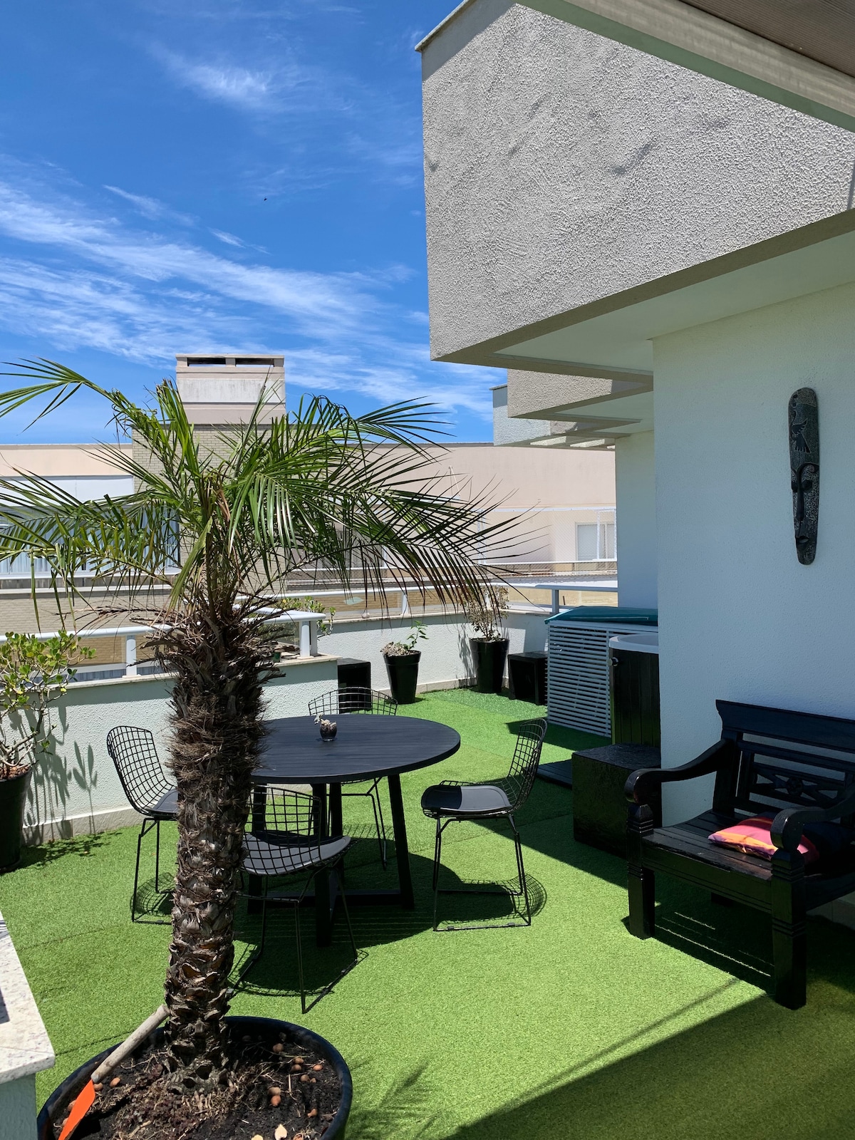 Studio penthouse with beautiful view and the sound of birds! Private outdoor area of 60m and 30m indoors. Complete and equipped kitchen, bed and bath linens; 43” smart TV, Wi-Fi, electronic lock, air-conditioning. Quiet, peaceful and cozy place! Partial view of Ilha do Campeche and Morro das Pedras beach, countryside and mountains. Large outdoor area with synthetic grass, Jacuzzi with hydromassage (cold), hammock, barbecue and table. Sunny days (north-facing) and unforgettable sunsets.