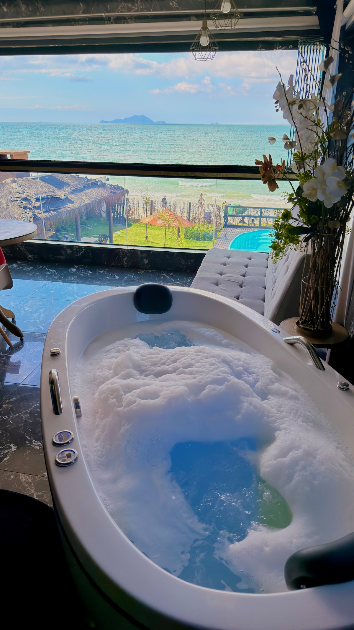 Luxurious and cozy space, remodeled in wood. Perfect internet for those who work from home. High-end Nipponflex bed with massage and heated Jacuzzi with hydro. For rainy or cold days, heater. The barbecue area overlooks the mountains and the Santinho sea. Located in the Santinho general area. Market and Buffet restaurant across the street. It is between 3 paradisiacal beaches with several trails. Come and experience this incredible magical spot on the best beach in Florianópolis.