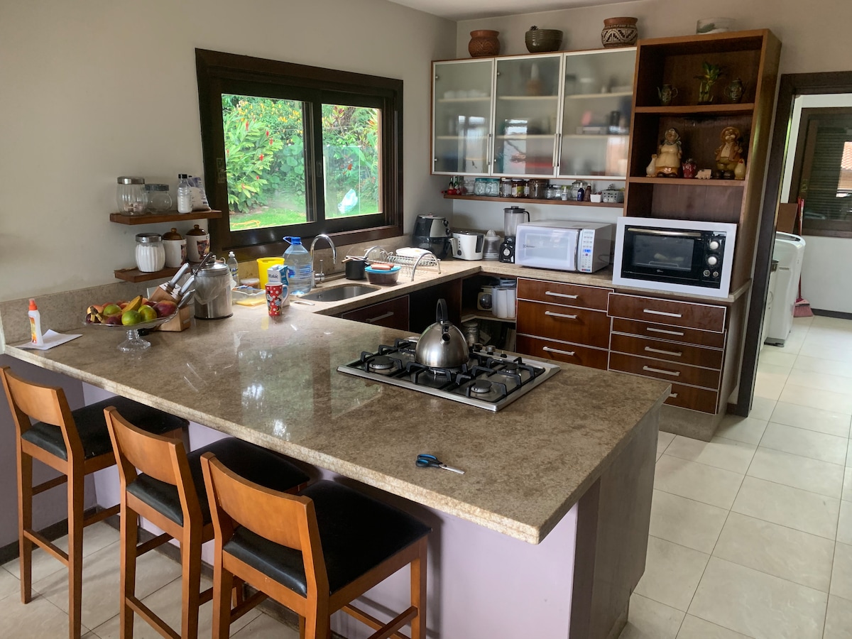 É uma casa muito confortável, com ambientes amplos e arejados; próxima a inúmeros restaurantes e supermercados. Todos os ambientes são climatizados (6 aparelhos de ar-condicionado). Tem 5 quartos sendo 3 suítes com jacuzzi. Com acomodações para 20 hóspedes ou mais. Ampla área de convivência com churrasqueira, para eventos de até 50 pessoas. Terreno de 5000 m² com jardim, bosque com casa da árvore e área para fogo-de-chão 🔥. 06 vagas privativas de estacionamento.