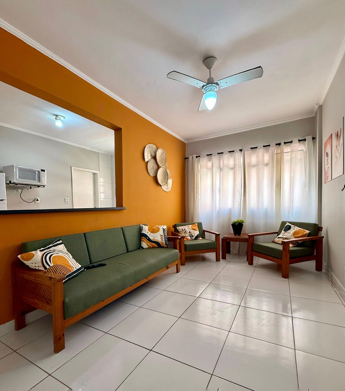 Apartamento bem localizado com 1 dormitório, 2 banheiros, sala ampla e 2 sacadas. Situado a apenas 110 metros da praia, conta com uma linda vista para o mar — ideal para quem busca praticidade, conforto e a tranquilidade de estar pertinho do mar. O apartamento possui excelente ventilação natural, e todos os ambientes contam com ventilador de teto. Cozinha equipada com micro-ondas, fogão, air fryer, cafeteira, liquidificador, sanduicheira e pipoqueira. Sala confortável com sofá-cama e bicama.
