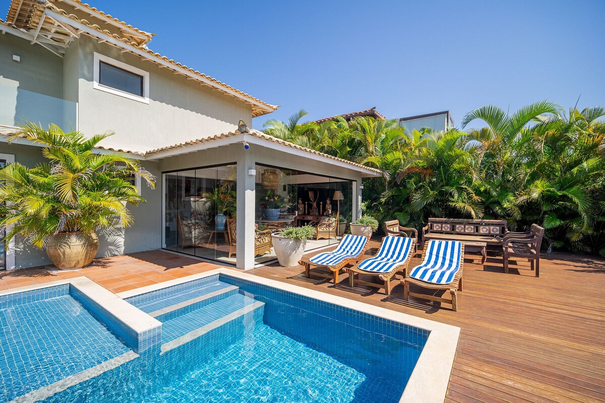 Beautiful house in the most charming condo in Buzios! With 5 suites, air-conditioning, internet and lots of comfort. The house has a swimming pool and private barbecue, full kitchen and deck overlooking the sea. Closed condominium and insurance The charming Village Búzios condominium is located on Praia dos Ossos. Walk to the beaches; dos Ossos, Azeda, Azedinha, João Fernando and more. Stroll along the Orla Bardot to Rua das Pedras without needing a car. Breakfast is sometimes included in the morning.