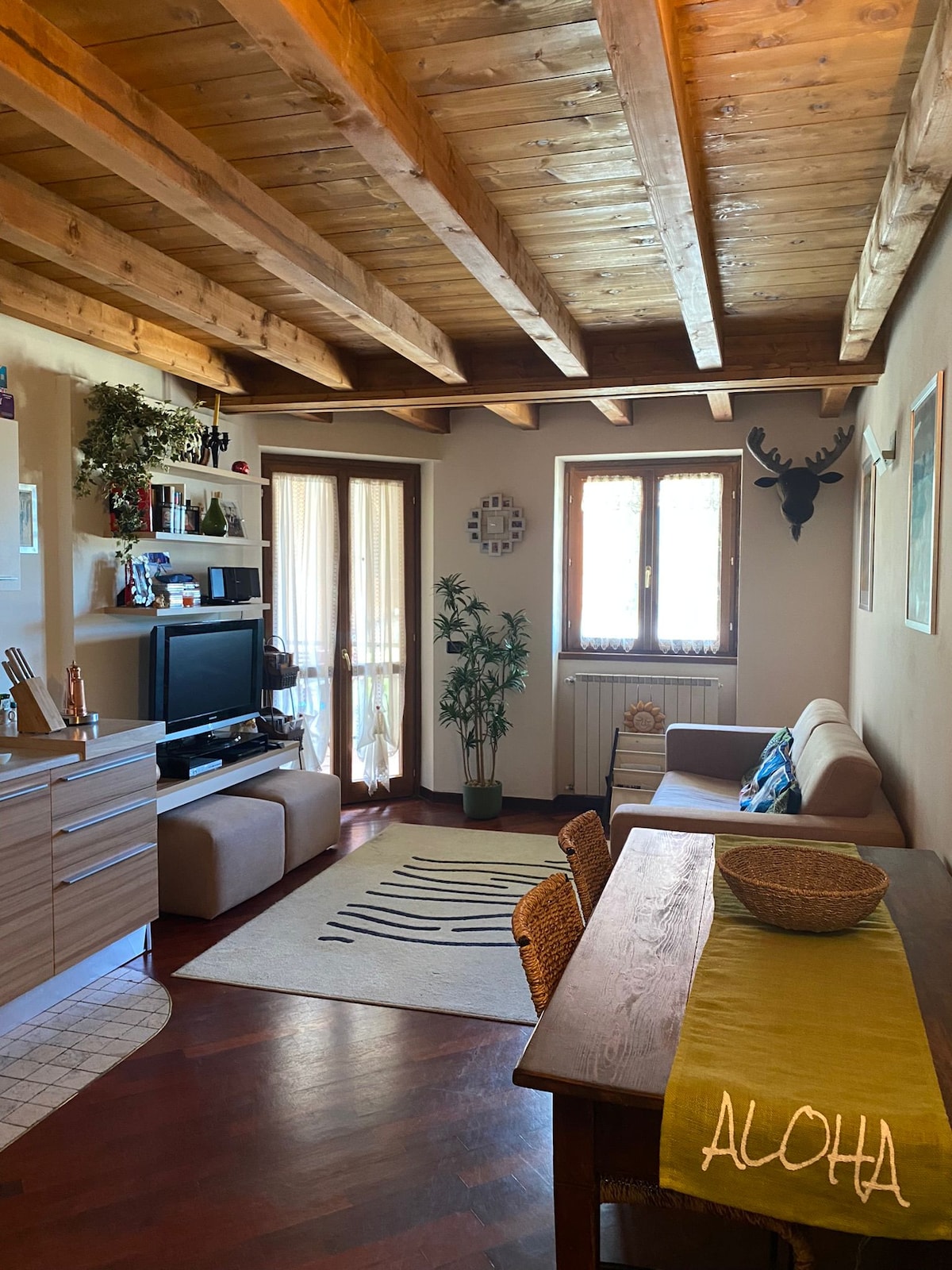 Newly-built house, tastefully and fully furnished, all modern comforts, wide windows and plenty of natural light, high wooden ceilings (4.5 m in the living room), suitable for 4/7 guests, two bedrooms and a sofabed, private indoor garage and more parking outside. Two spacious balconies in solid wood with deck chairs, small table and chairs (fine for aperitfs). Pizzeria 50 m. away, bakery across the street. Dedicated area for skis and skiboots. Town centre only 5-minute walk away.