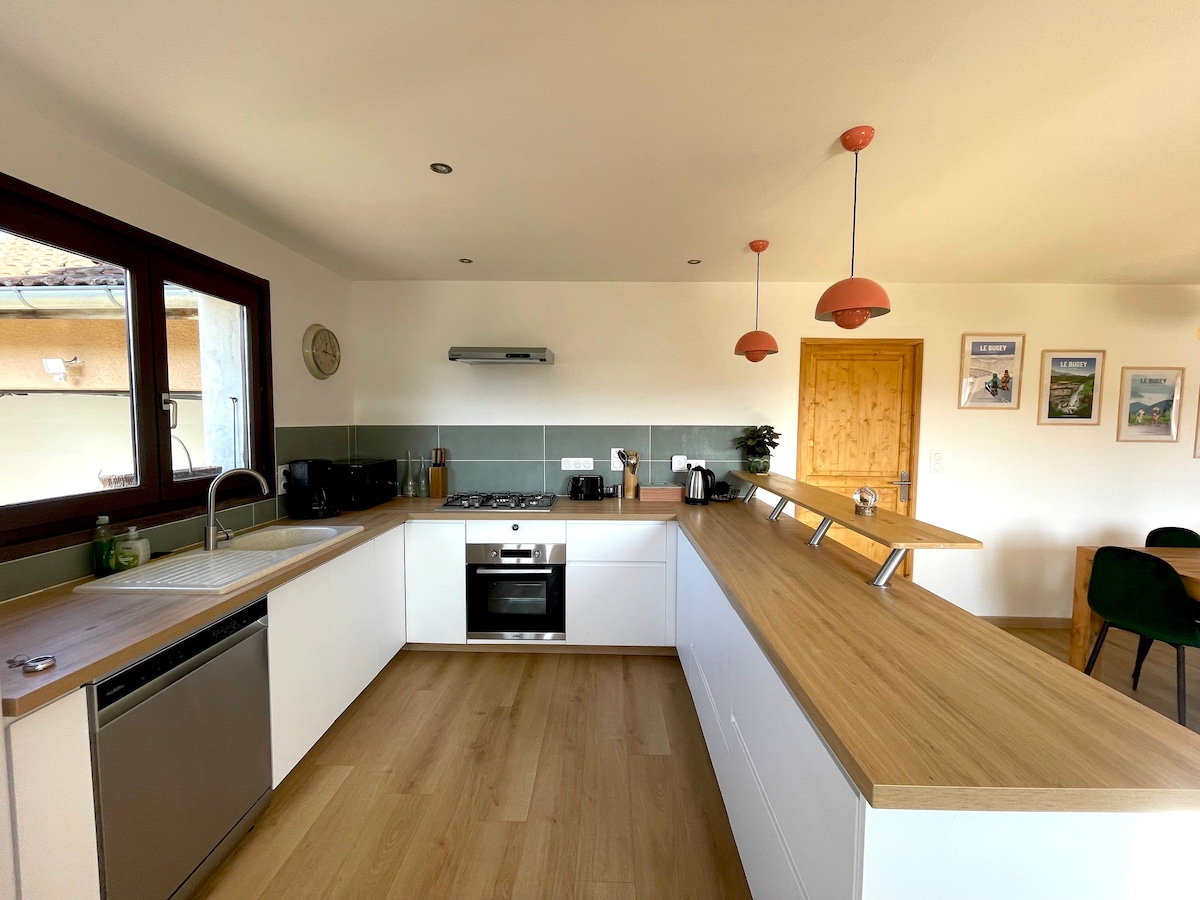 Welcome to an independent studio in Serrieres de Briord at the foot of the Bugey mountains. The entrance is on the ground floor and the studio is on the 1st floor accessible by a spiral staircase. A bicycle garage is available. You can park your motorcycle in the garden of the house. Beautiful hikes are possible from the house and outdoor activities such as canyoning, climbing, kayaking, paragliding or caving are available to you.