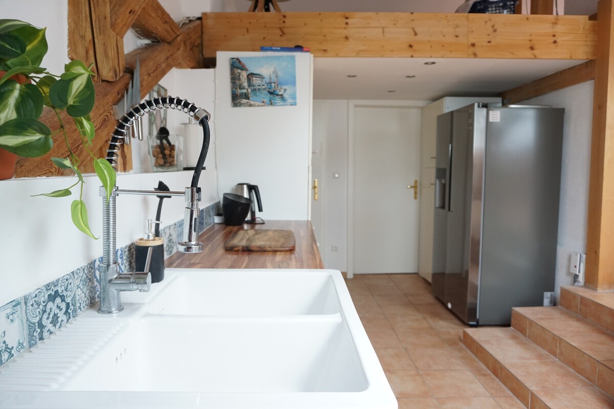 The 78 sqm 2-room apartment in the "House of Encounters" offers space for a cozy vacation experience for families/couples, friends and business travelers. In addition to a separate bedroom, there is a living room with a double sofa bed (TV, fireplace, access to the kitchen). The kitchen has basic equipment (+ dishwasher, fridge) as well as a typical Bavarian sitting area. The bathroom is equipped with two sinks, shower, bathtub, toilet & bidet. On top there is a mini balcony.