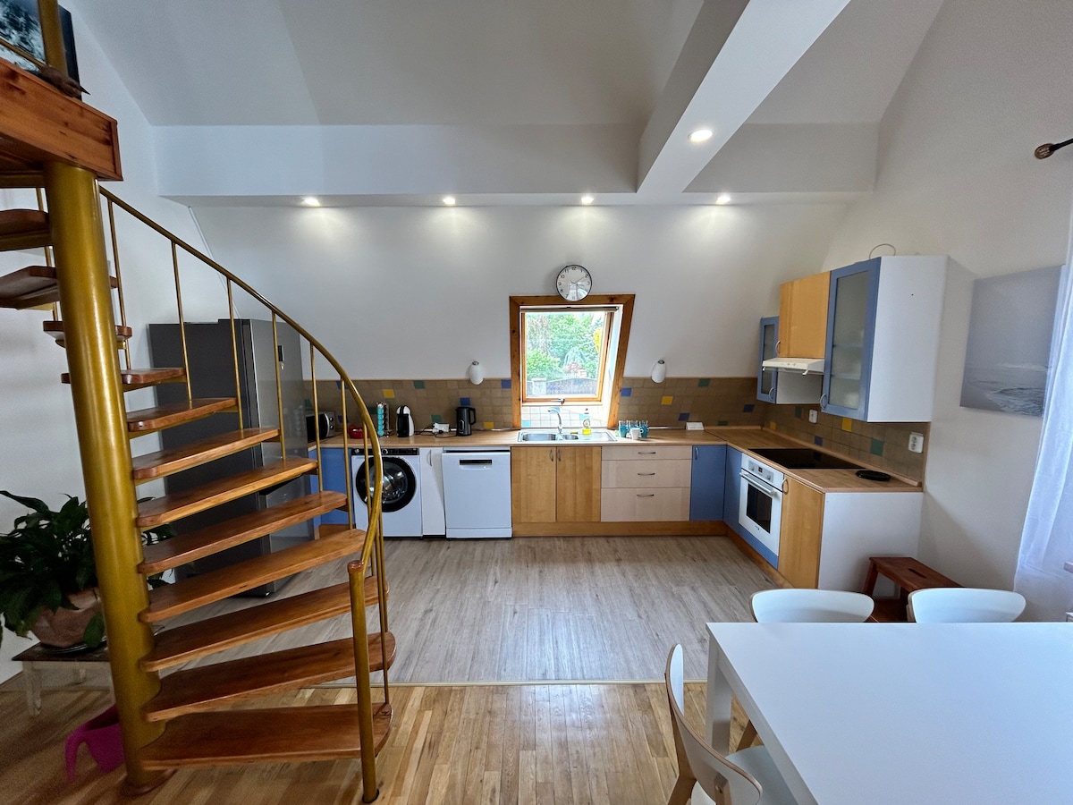 Duplex 3+kk apartment located in a quiet residential area of Prague - Radotín, not far from the airport and the city center. The apartment is part of a newly built family villa with its own entrance and yard. It is possible to park in front of the house at any time without any problems. Ideal for those looking for a quiet place with the possibility of enjoying the nearby center of Prague.